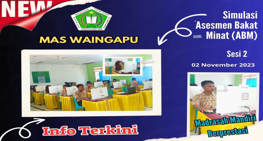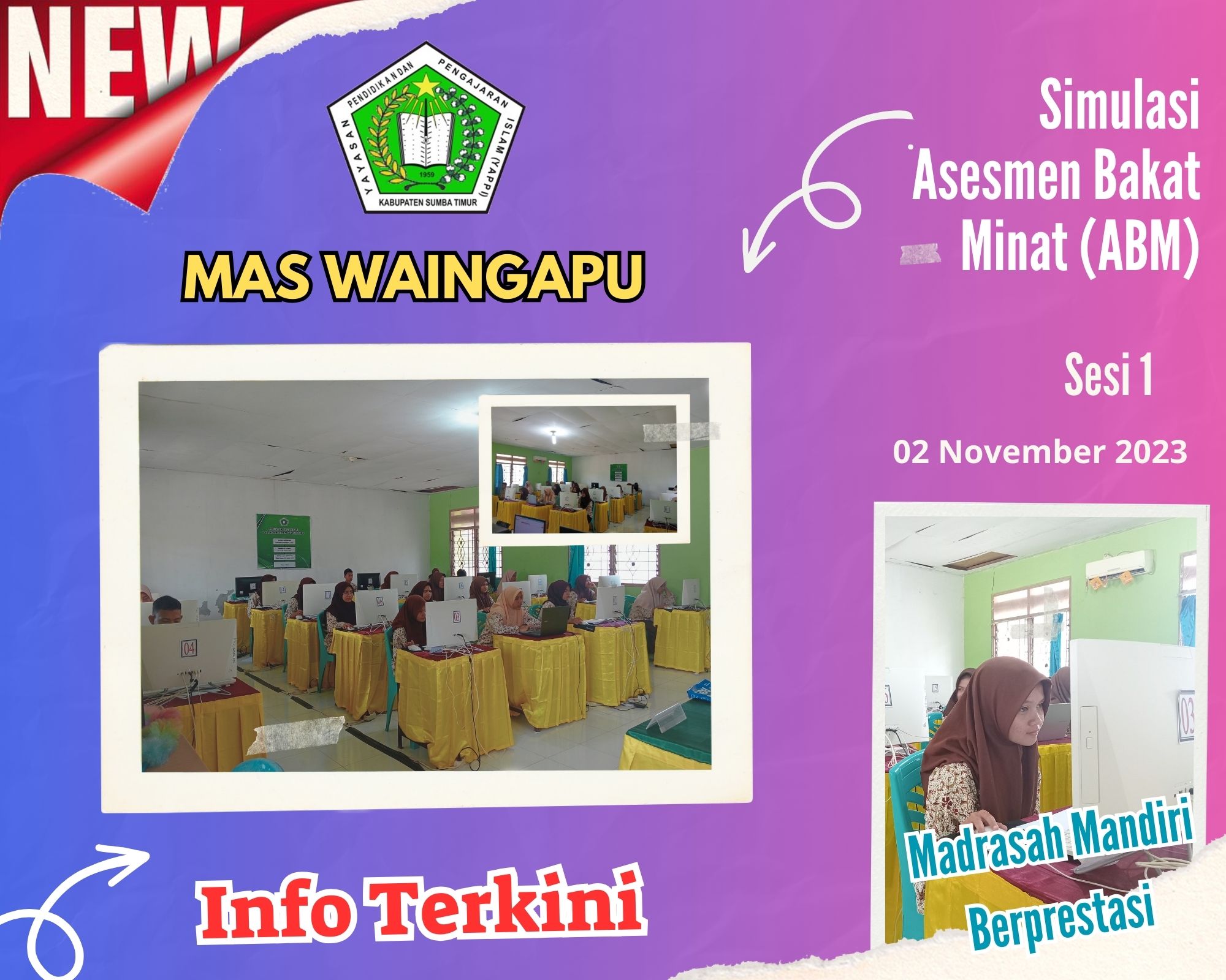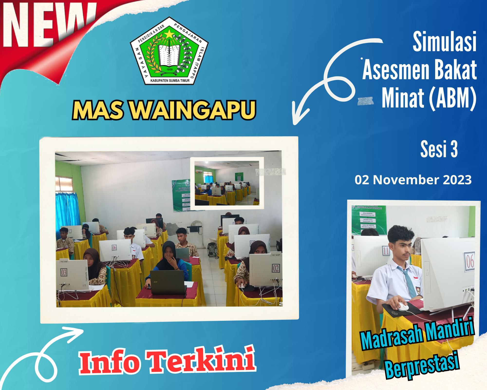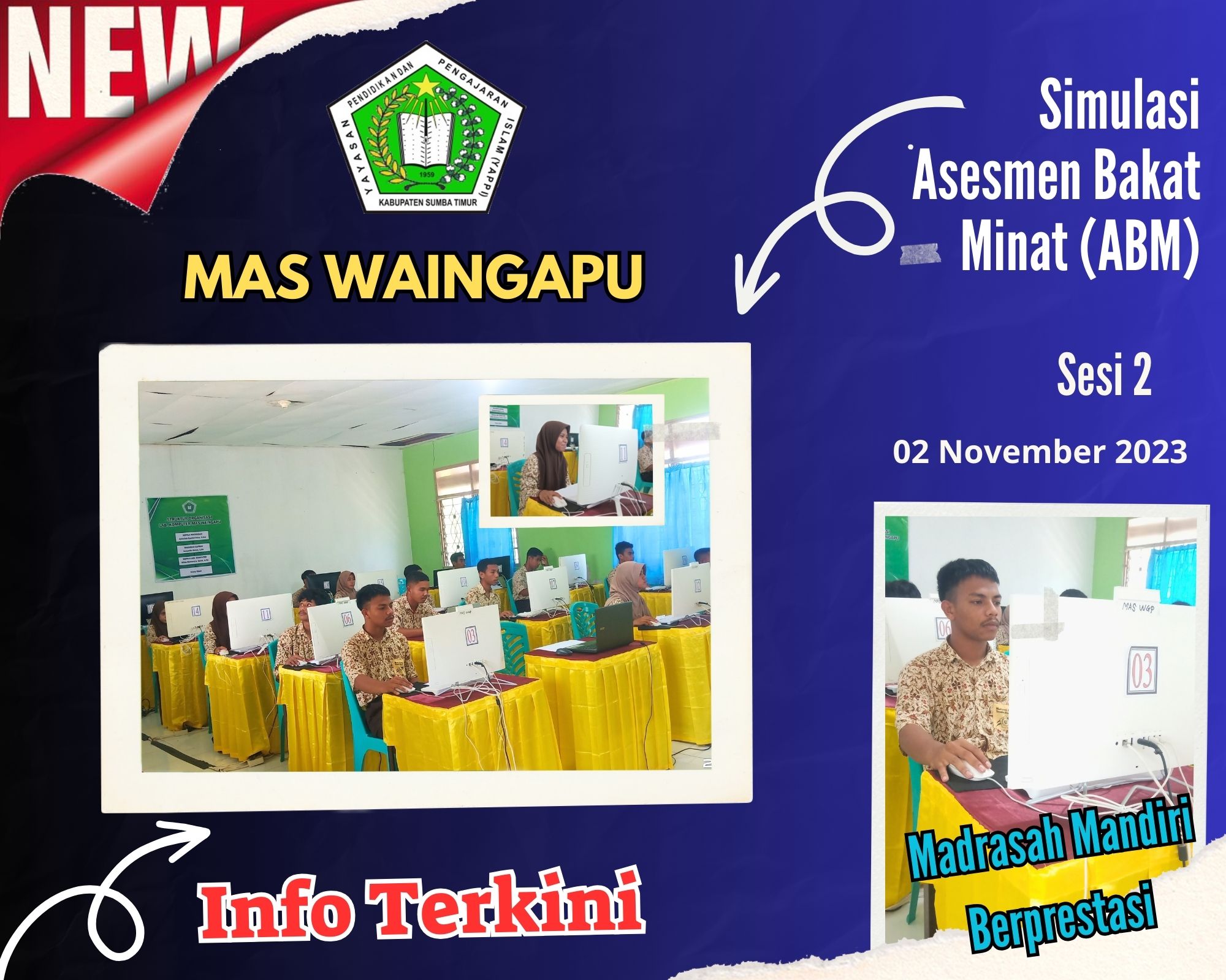Simulasi Asesmen Bakat Minat (ABM) MAS Waingapu diikuti seluruh Siswa - Siswi Kelas XII IPA/IPS berjumlah 66 orang yang dibagi menjadi 3 sesi yakni masing-masing sesi Berjumlah 22 orang dan dipandu tim PROTEK ABM yaitu Ibu Wilda Mawarni Ahmad Karim,S.Pd dan Bpk Sumardin Bailah, S.Pd.