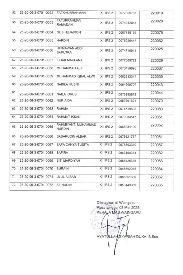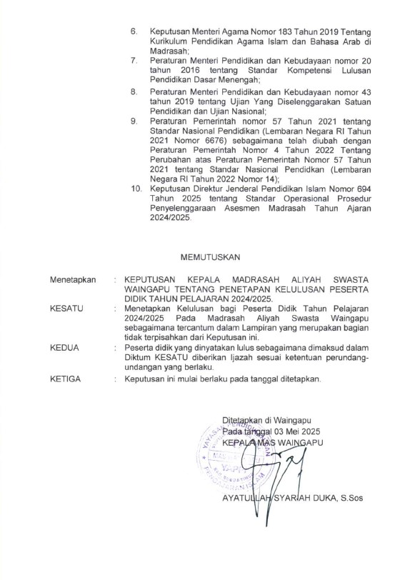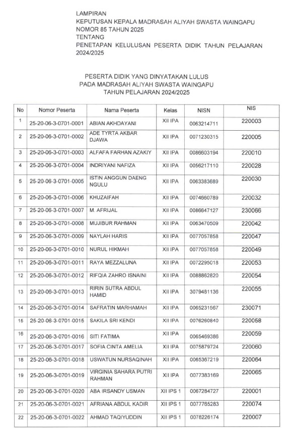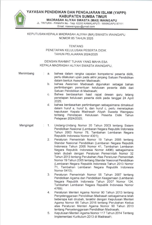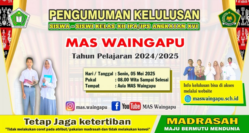 Pengumuman Kelulusan Siswa/i MAS Waingapu Angkatan XVI Tahun 2025