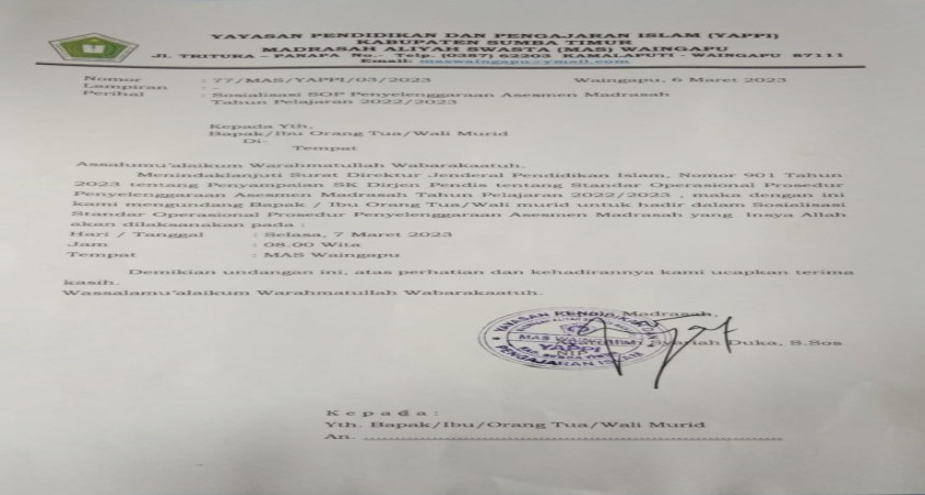 Hari Kedelapan Penerimaan Peserta Didik Baru MAS Waingapu Tahun Ajaran 2025/2026
